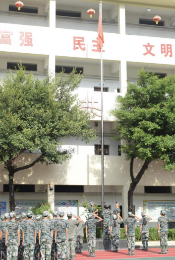 典礼的第一项议程升国旗仪式,全体学员整齐列队,迎着旭日升起的五星红旗,向国旗敬礼,神圣肃穆的氛围充满着整个校园。