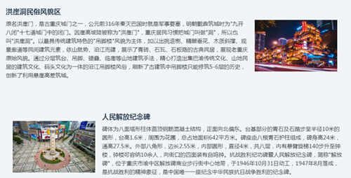 作为旅游胜地,重庆有诸多打卡景点。现实版“千与千寻”洪崖洞,夜晚灯火辉煌,美轮美奂;李子坝轻轨站,轻轨穿楼而过的奇特景象吸引了无数游客前来拍照留念;解放碑是重庆的象征,代表着重庆的城市形象和精神风貌,也经常出现在各种商品及场所的徽标之中,是重庆人心中的精神寄托和骄傲;朝天门来福广场,它是展示重庆经济与产业发展的“城市封面”,为重庆带来了可观的发展机遇,也成为外资机构和外事活动的重要集聚地、大型国际国内会议的承接地。
