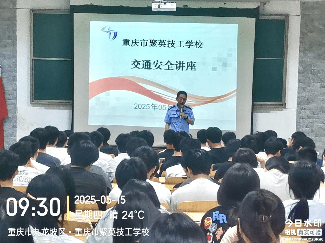 为切实增强师生交通安全意识,预防和减少道路交通事故发生,2025年5月15日上午9点,重庆市九龙坡区交巡警支队中梁山大队王警官在一阶梯教室为全校师生带来一场生动实用的交通安全讲座。